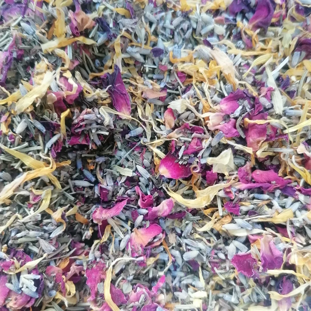 Rose, Calendula and Lavender for their soothing, anti inflammatory and relaxing properties, with Hibiscus in both chunky and fine cut for their skin brightening properties.